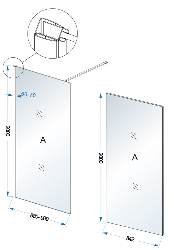 inloopdouche 90cm breed 200cm hoog inclusief chroom zijprofiel en chroom stabilisatiestang van 100cm